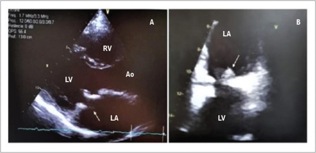 A) 2D TTE in longitudinal parasternal position showing mitral prosthesis with thickened leaflets and pannus aspect. B) 2D TEE at 60º showing an oval shape adhered to the posterior leaflet atrial face. RV: right ventricle; LV: left ventricle; AO: aorta; LA: left atrium.