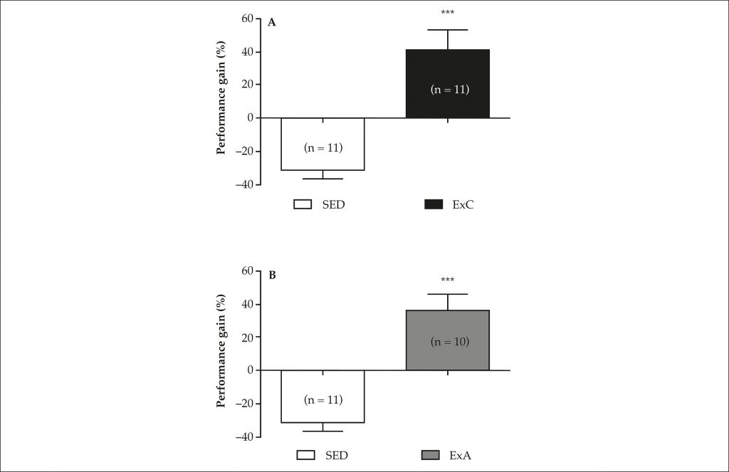Fitness was significantly greater in CEx and AEx rats as compared with SED animals. In addition, compared with the SED group, CEx animals had a lower body mass gain, and the aorta obtained from these animals had reduced contractile response to norepinephrine and greater acetylcholine-induced relaxation. These results were not observed in ACEx animals.