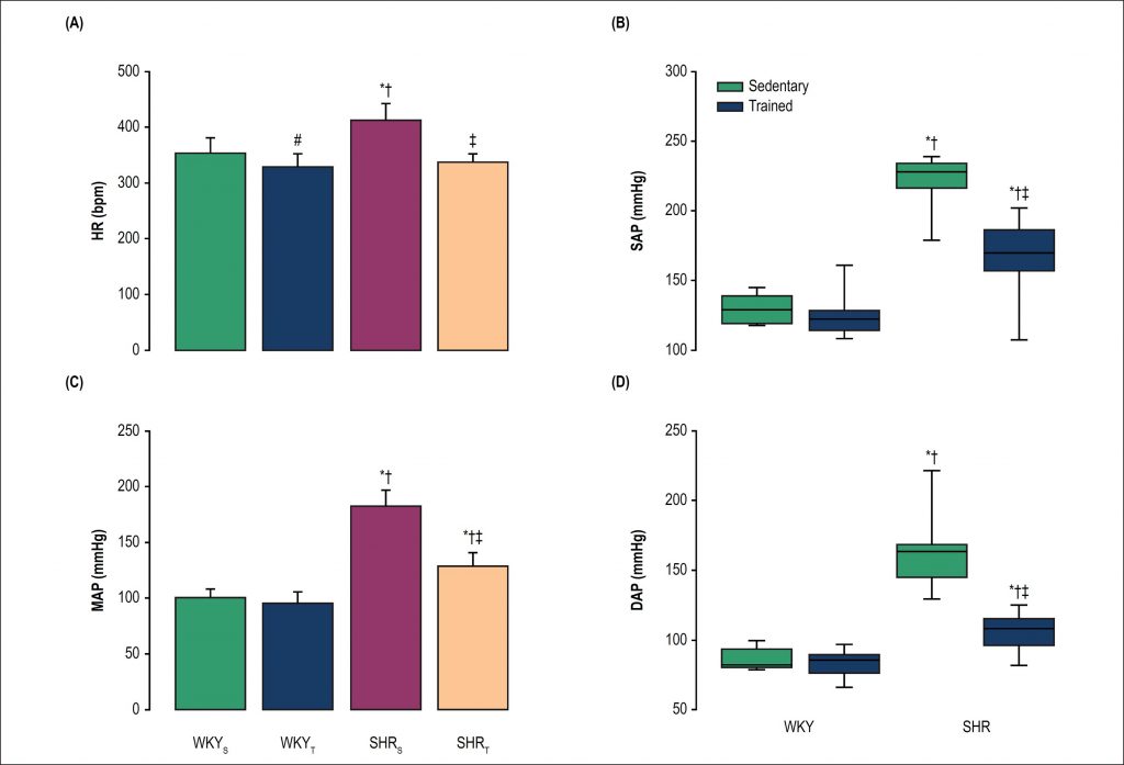 Normotensive sedentary (WKYS) and trained (WKYT) rats, and hypertensive sedentary (SHRS) and trained (SHRT) rats were included in this study. After 9 weeks of experimental protocol (swimming training or sedentary control), arterial pressure (AP) and heart rate (HR) were recorded in freely moving rats. We assessed the autonomic control of the heart by sympathetic and vagal autonomic blockade. Morphometric analyses of arterioles were performed in spleen tissues. The statistical significance level was set at p < 0.05.