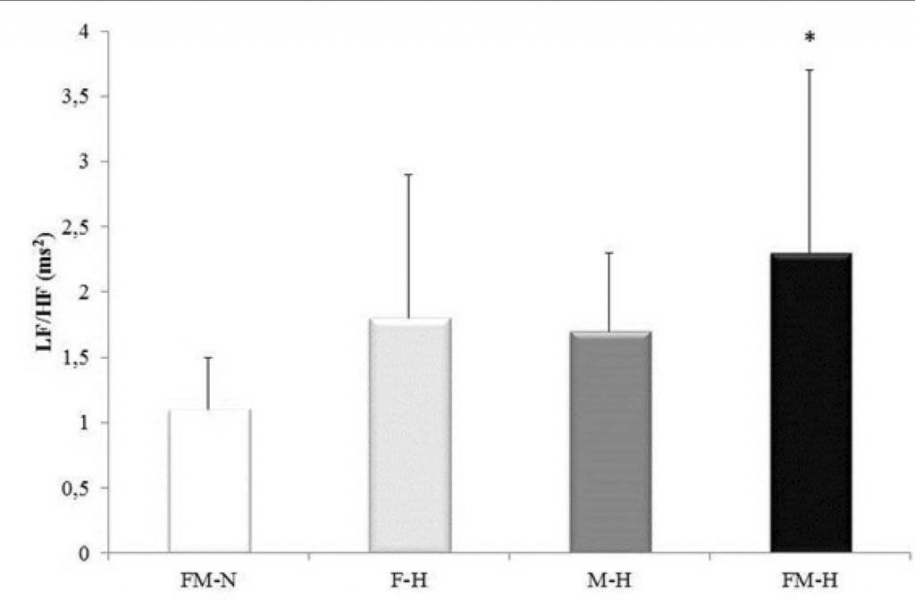 The standard deviation of normal RR intervals (SDNN; FM-N=314±185; FM-H=182.4± 57.8), the square root of the mean squared differences in successive RR intervals (RMSSD; FM-N=248±134; FM-H=87±51), the number of interval differences of successive NN intervals greater than 50ms (NN50; FM-N=367±83.4; FM-H=229±55), the ratio derived by dividing NN50 by the total number of NN intervals (pNN50; FM-N=32.4±6.2; FM-H=21.1±5.3) and the high (HF; FM-N=49±8.9; FM-H=35.3±12) and low-frequency (LF; FM-N=50.9±8.9; FM-H=64.6±12) components, in normalized units (%), were significantly lower in the FM-H group than in the FM-N group (p<0.05). On the other hand, the LF/HF ratio (ms2) was significantly higher (p<0.05). We found no significant difference between the groups in VO2maxand FMD (p<0.05).