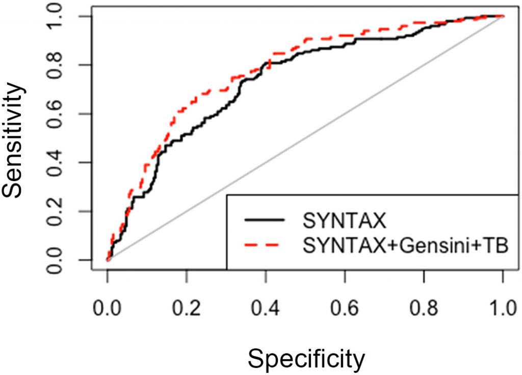 A total of 481 patients were included (mean age 61±11 years). No-reflow occurred in 32.8%. SYNTAX score (OR=1.05, 95%CI 1.01–1.08, p<0.01), thrombus burden (OR=1.17, 95%CI 1.06–1.31, p<0.01), and Gensini score (OR=1.37, 95%CI 1.13–1.65, p<0.01) were independent predictors of no-reflow. Combined scores had a larger area under the curve than the SYNTAX score alone (0.78 [0.73–0.82] vs 0.73 [0.68–0.78], p=0.03). Analyses of both categorical (0.11 [0.01–0.22], p=0.02), and continuous net reclassification improvement (NRI>0) (0.54 [0.035–0.73], p<0.001) showed improvement in the predictive ability of no-reflow in the combined model, with integrated discrimination improvement (IDI) of 0.07 (0.04–0.09, p<0.001).