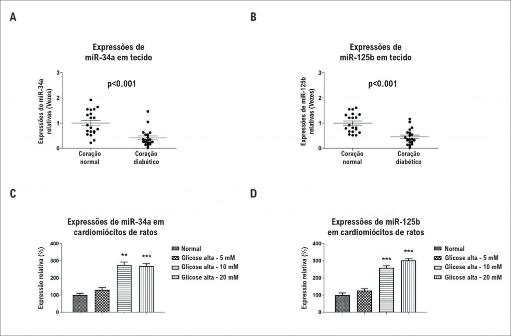 Rat primary cardiomyocytes were isolated and exposed to normal and high concentrations of glucose. Cell viability was measured using MTT assay. Expressions of miR-34a and miR-125b were detected by qRT-PCR. Potential targets of miR-34a and miR-125b were predicted from www.Targetscan.org and validated from human heart tissues. A statistical significance of p<0.05 was considered.