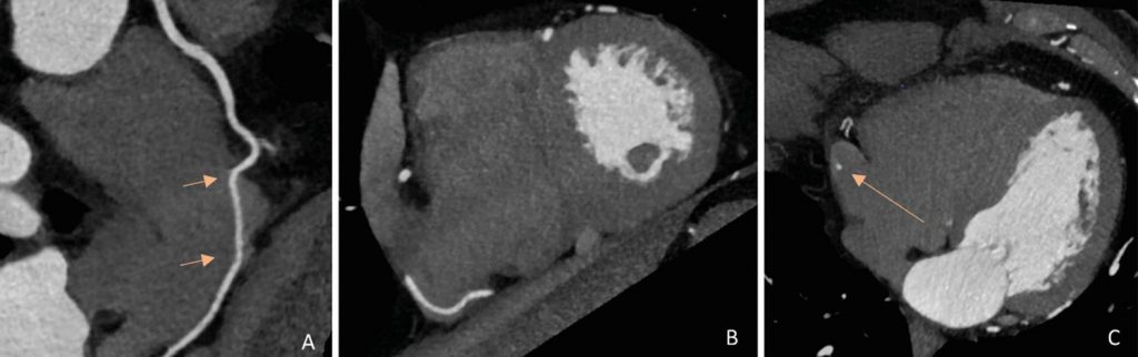 A 66-year-old man with a history of palpitations suggestive of paroxysmal supraventricular tachycardia was referred for CT angiography (CTA) for exertional dyspnea etiology investigation. ECG-gated cardiac CT was performed using the 64-slices dual-source Somatom Go Scanner.