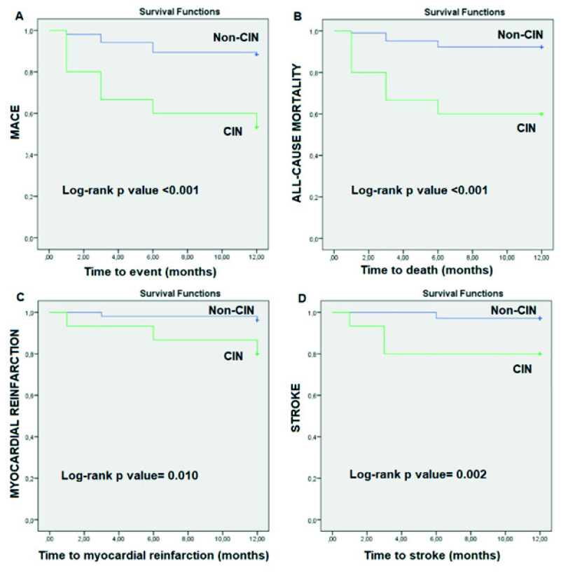 This study included a total of 758 patients with NSTEMI, who underwent percutaneous coronary intervention (PCI); 15 developed CIN after PCI, and another 104 were the control group, matched for age > 65 years. Baseline to 48-to-72-hour laboratory values and clinical outcomes were recorded. Patients were followed during one year. P values of < 0.05 were considered significant.