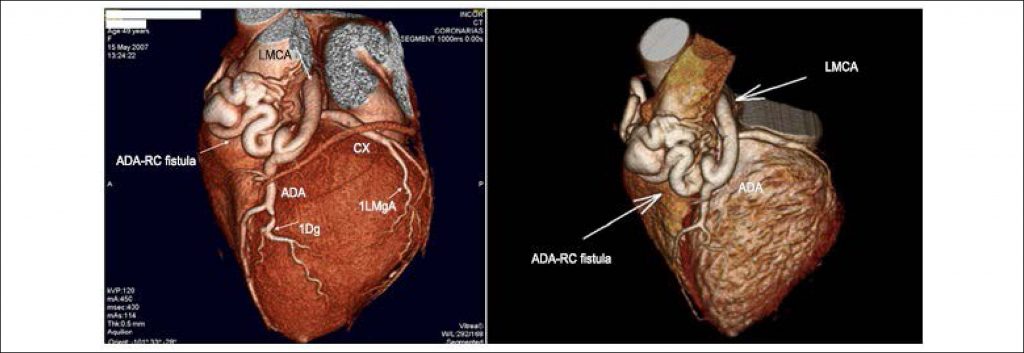 A 59-year-old asymptomatic female patient, with a diagnosis of a large bilateral coronary-pulmonary artery fistula made in 2007 was investigated after a cardiac murmur was identified on a routine examination. At the time, conservative treatment was chosen. Cardiac auscultation showed a more audible systolic-diastolic murmur in the upper left sternal border, with a more audible component in systole. There were no other findings in the cardiological physical examination or even the overall segmental examination. The patient had no comorbidities at the time, except for a prior history of smoking (10-pack-years). During the evolution, at the annual outpatient follow-up, she had diagnoses of dyslipidemia, glucose intolerance and depression. At the last consultation, in 2017, the patient was asymptomatic. She used atenolol 25 mg/ day, metformin 850 mg/day, atorvastatin 20 mg/day and sertraline 50 mg/day.