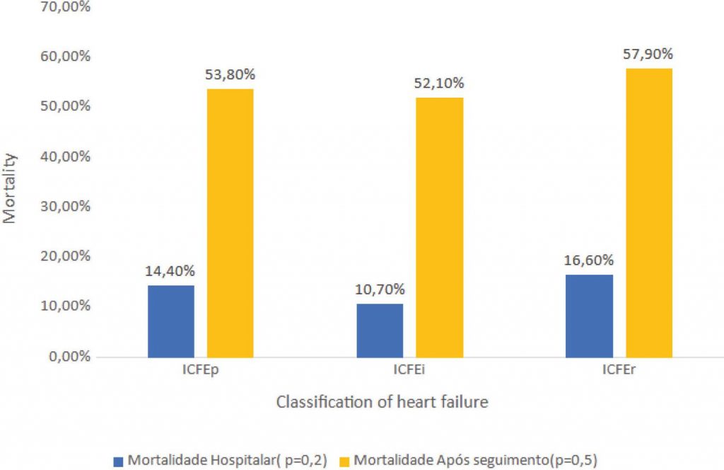 To analyze the clinical characteristics, comorbidities, complications, and in-hospital and late mortality of patients classified as having HF with mid-range EF (HFmrEF – EF: 40%-49%), and to compare them to those of patients with HF with preserved EF (HFpEF – EF > 50%) and with HF with reduced EF (HFrEF – EF < 40%) on admission for decompensated HF.