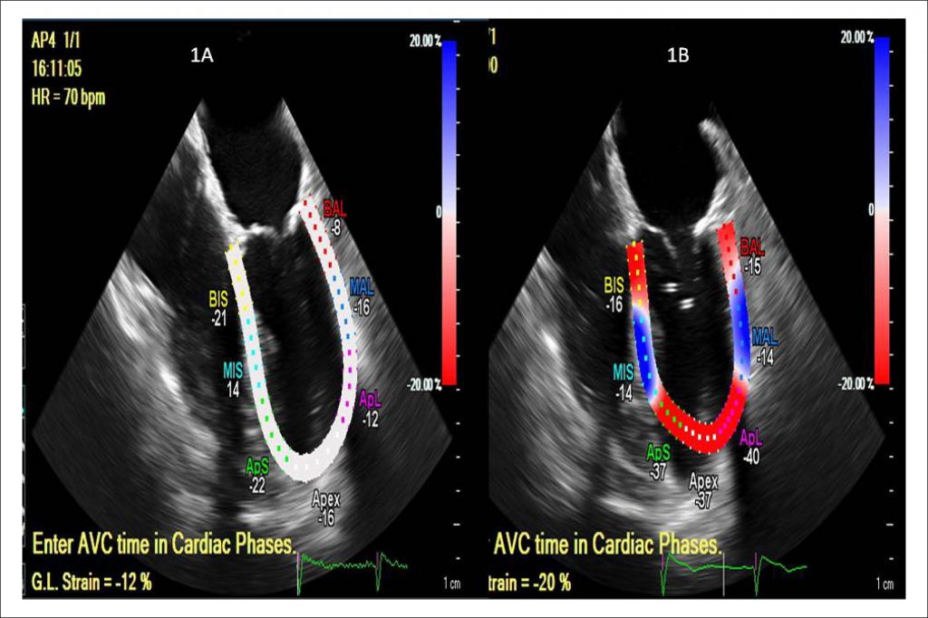 Similarly, previous investigations have shown that the study of myocardial deformation is able to detect sudden and early alterations in systolic function of valve disease patients, even before they present LVEF modifications.,, This phenomenon is due to a significant decrease in myocardial deformation in three different spatial planes, triggering deformation modifications in the longitudinal, circumferential and radial axes. In patients who present reduced longitudinal myocardial deformation, we can observe radial deformation that is superior to normality parameters, which may result in preserved ventricular function, when estimated by LVEF. Other applications of myocardial deformation include amyloidosis, hypertrophic cardiomyopathy, right ventricular dysfunction, athlete’s heart, cardiac dyssynchrony and valve diseases (mitral insufficiency and aortic stenosis).