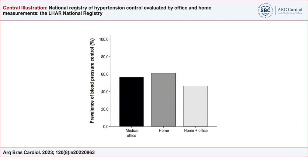 BP control in the offices of a sample of Brazilian cardiologists was 56.3%; this rate was 61% when BP was measured at home and 46.4% when considering both the office and home.