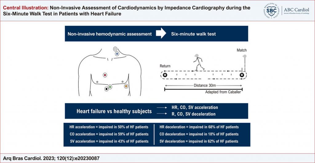 The six-minute walk test (6MWT) is commonly used to evaluate heart failure (HF) patients. However, several clinical factors can influence the distance walked in the test. Signal-morphology impedance cardiography (SM-ICG) is a useful tool to noninvasively assess hemodynamics.