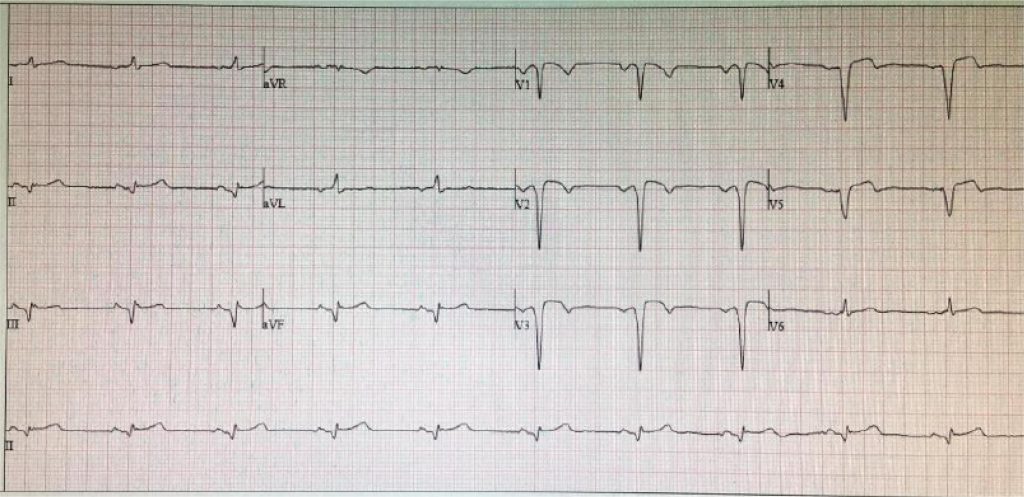 A 50-year-old male patient, with history of well-controlled hypertension and no known personal or family history of cardiac disease, presented with chest pain followed by syncope during strenuous physical activity. The electrocardiogram showed sustained monomorphic ventricular tachycardia. Electrical cardioversion was performed, with conversion to sinus rhythm with Q waves on leads V2-5 and III-aVF (). Transthoracic echocardiography (TTE) showed asymmetric left ventricular (LV) hypertrophy, preserved ejection fraction (EF) with apical akinesia, and hypertrabeculated right ventricle (RV). Coronary angiography showed no significant lesions. Cardiac MRI confirmed the TTE findings, showing a maximum LV wall thickness of 17 mm at the interventricular septum (Figure S1 — supplementary material), apical LV aneurysm and abnormal insertion of papillary muscles. The right side was remarkable for hypertrabeculated and hypokinetic free and inferior walls, and mildly dilated RV with reduced EF (33%). Besides having transmural delayed enhancement (DE) on the LV apex, there was also nodular DE on the LV/RV junction and on the free and inferior basal walls of the RV (; –; Figure S2 of supplementary material). Genetic analysis found a heterozygous mutation on the PKP2 gene (p.Thr50Serfs*61), a pathogenic variant associated with arrhythmogenic RV cardiomyopathy. However, no known mutation on genes related to hypertrophic cardiomyopathy (HCM) were found on a panel of 204 genes, 118 related to HCM. No association has been firmly made between mutations on the PKP2 gene and HCM. The overlap between genetics and cardiomyopathy phenotypes is a well-known phenomenon. We hypothesize that this patient either had an additional unknown HCM gene mutation or, less likely, a phenotypic expression of two different cardiomyopathies in the context a PKP2 gene mutation.