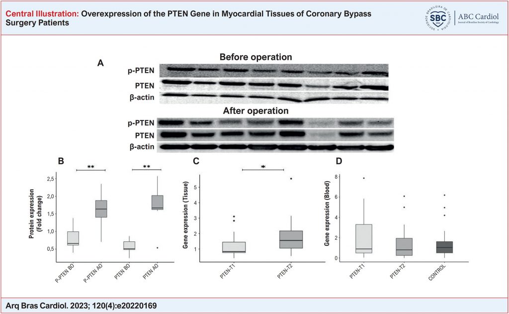 Molecular studies were performed at Erciyes University Genome and Stem Cell Center (GENKOK). Right atrial appendage and blood samples were taken from the central vein of 22 coronary bypass surgery patients before starting and ending cardiopulmonary bypass. PTEN expression was determined using quantitative real-time PCR and western blot analysis. The significance level was accepted as p<0.05.