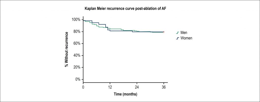 Cohort study of patients undergoing first-ever PAF catheter ablation procedure refractory to antiarrhythmic drugs. The information was taken from patients’ records by means of a digital collection instrument and indexed to an online database (Syscardio®). Clinical characteristics and procedures were compared between each gender (M x F), adopting a level of statistical significance of 5%. The primary endpoint associated with efficacy was freedom from atrial arrhythmia over the follow-up time.
