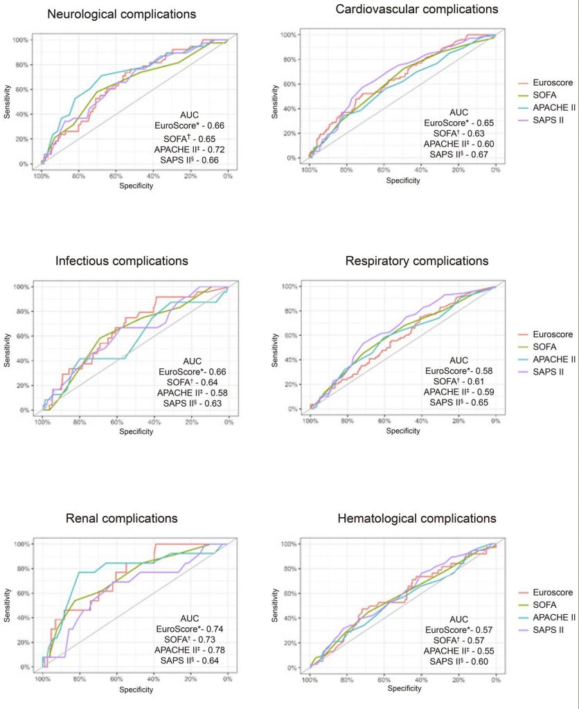A cross-sectional study with retrospective analysis of electronic medical records of patients aged ≥ 18 years who underwent isolated CABG and were admitted to the ICU of a cardiology hospital in São Paulo, Brazil. The areas under the receiver operating characteristic curves (AUC) with a 95% confidence interval were analyzed to verify the accuracy of the European System for Cardiac Operative Risk Evaluation (EuroScore), Acute Physiology and Chronic Health Evaluation (APACHE II), Simplified Acute Physiology Score (SAPS II) and Sequential Organ Failure Assessment (SOFA) indices in predicting complications.