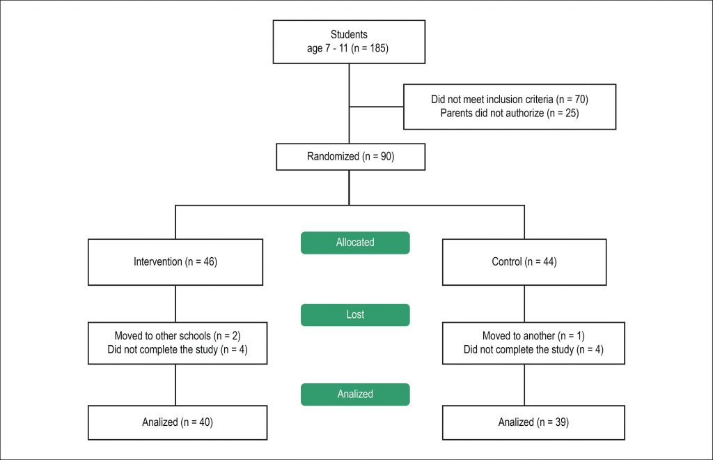 Seventy-nine students were randomized to the intervention (n = 40) or the control group (n = 39). Mean age was 10.0 ± 1.1 years. After eight weeks, the intervention group showed significant improvement in the knowledge score (p < 0.001). There was an increase in physical activity scores in both groups, but with no difference between the groups at the end of intervention (p = 0.209). A reduction in the BMI percentile was observed in the intervention group, but there was no significant statistical difference between the two groups after the intervention.