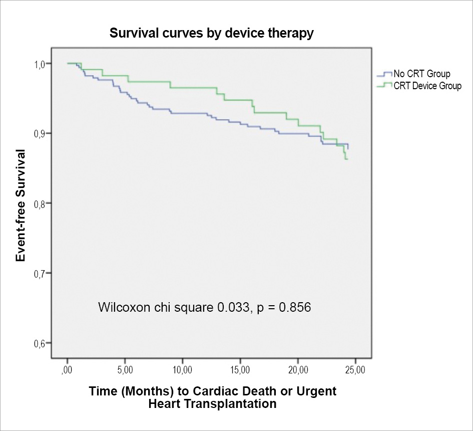 Prospective evaluation of consecutive heart failure (HF) patients with left ventricular ejection fraction ≤40%. The primary endpoint was a composite of cardiac death and urgent heart transplantation (HT) in the first 24 follow-up months, and was analysed by several CPET parameters for the highest area under the curve (AUC) in the CRT group. A survival analysis was performed to evaluate the risk stratification provided by several different cut-offs. p values <0.05 were considered significant.