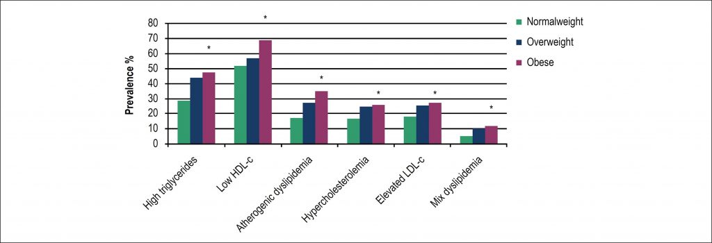 Mean age was 44.8 ± 0.39 years and 68.5% were females. The prevalence of lipids abnormalities related to the metabolic syndrome (low HDL-c [58.6%; 95% CI 54.9 – 62.1] and elevated triglycerides [39.7%; 36.1 – 43.2]) were the most prevalent lipid alterations, followed by atherogenic dyslipidemia (25.9%; 22.7 – 29.1), elevated LDL-c (23.3%; 20.2 – 26.4), hypercholesterolemia (22.2%; 19.2 – 25.2), and mix dyslipidemia (8.9%; 6.8 – 11.0). Dyslipidemia was more prevalent with increasing body mass index.