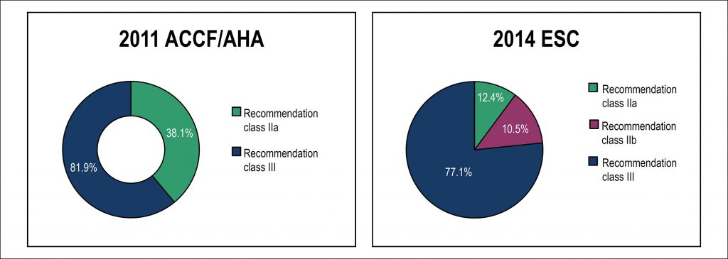 Regarding primary prevention, according to the 2011 ACCF/AHA recommendations, 39.0% of the patients had indication for ICD implantation (level of evidence IIa). Using the 2014 guidelines, only 12.4% of the patients had an indication for ICD implantation. Comparing the two risk stratification models for patients with HCM, we detected a significant reduction in the number of indications for ICD implantation (p < 0.001). Of the 41 patients classified as IIa according to the 2011 recommendations, 68.3% received a different classification according to the 2014 guidelines.