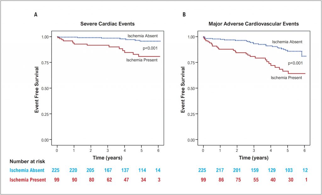 Between 2010 and 2015, consecutive patients aged 65 years or older referred for adenosine stress CMR were followed for the occurrence of severe cardiac events (cardiac death and nonfatal myocardial infarction) and major adverse cardiovascular events (MACE) that also included hospitalization for heart failure and ischemic stroke. Univariate and multivariate analyses were performed to determine the prognostic value of myocardial ischemia, with p-value <0.05 considered statistically significant.