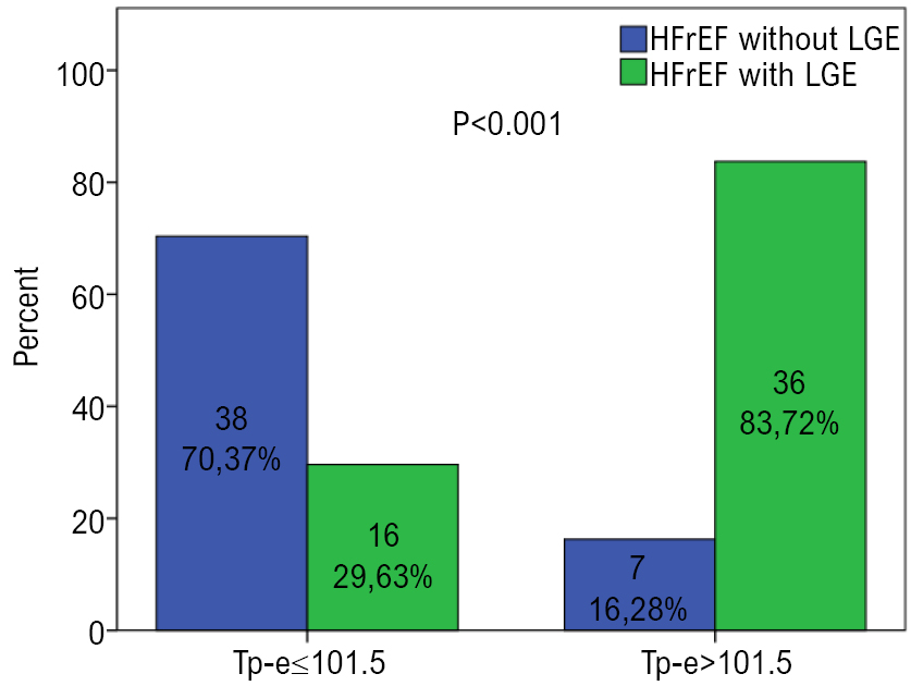 LGE was detected in 52 (53.6%) out of 97 HFrEF patients. QTc intervals (p=0.001), Tp-e intervals (p<0.001), frontal QRS-T angles (p<0.001) were found to be significantly higher in LGE group when compared to non-LGE group. In univariate regression analysis which was performed to investigate the predictors of LGE in HFrEF, all three repolarization parameters were reached significant values but in multivariate analysis the only repolarization parameter remained significant was Tp-e interval (OR=1.085 95% CI 1.032-1.140, p=0.001).