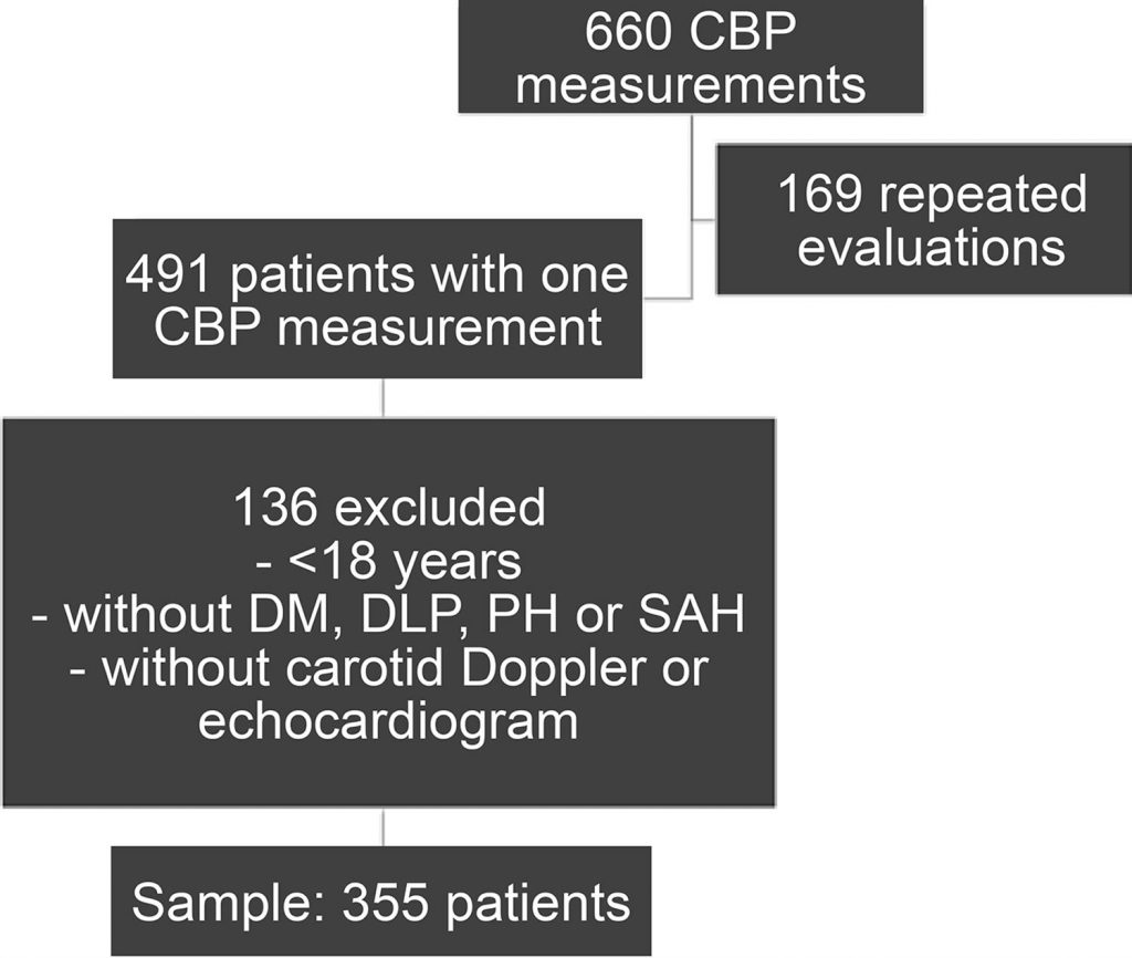This was an analytical, retrospective, cross-sectional study. Medical records of patients with diabetes mellitus, dyslipidemia, and pre-hypertension or hypertension, who underwent central blood pressure (CBP) measurement using Mobil-O-Graph®, and carotid doppler or echocardiography three months before and after the CBPM were analyzed. Statistical analysis was performed using Pearson or Spearman correlation, linear bivariate and multiple regression analysis, and the t test (independent) or Mann-Whitney test. A p <0.05 indicated statistical significance.