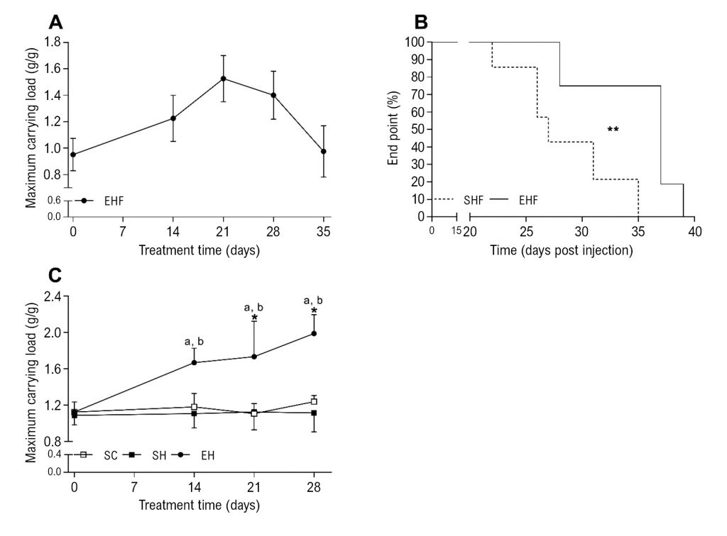 Male Wistar rats (Body weight: ~ 200 g) were used. To assess the time to potential heart failure onset (i.e., end point), rats were divided into sedentary hypertension until failure (SHF, n=6) and exercise hypertension until failure (EHF, n=6) groups. To test RT effects, rats were divided into sedentary control (SC, n = 7), sedentary hypertension (SH, n=7), and exercise hypertension (EH, n=7) groups. PAH was induced by two MCT injections (20 mg/kg, with 7 days interval). Exercise groups were submitted to an RT protocol (Ladder climbing; 55-65% of carrying maximal load), 5 times/week. Statistical significance was assumed at P < 0.05.