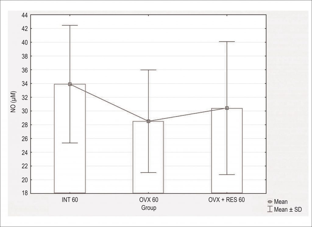 3-month old female Wistar rats were used and distributed in 6 groups: intact groups with 60 or 90 days, ovariectomized groups with 60 or 90 days, and ovariectomized treated with resveratrol (10 mg/kg of body weight per day) for 60 or 90 days. The number of days in each group corresponds to the duration of the experimental period. Vascular reactivity study was performed in abdominal aortic rings, systolic blood pressure was measured and serum nitric oxide (NO) concentration was quantified.