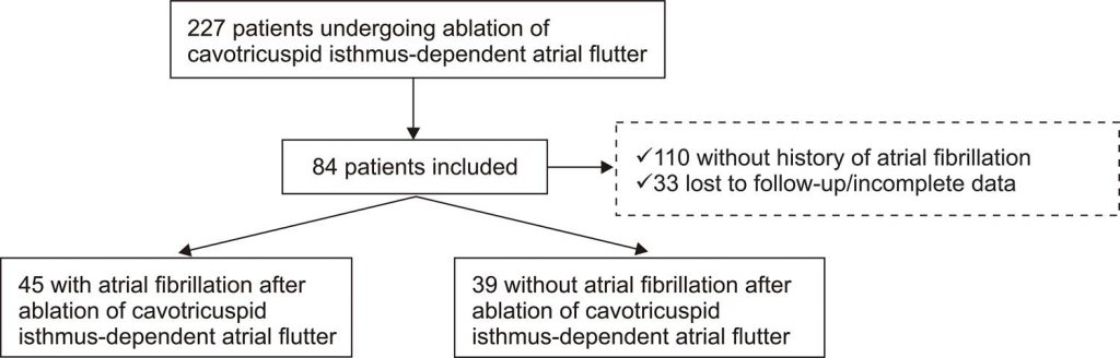 Of a total of 227 patients undergoing ablation of CTI-dependent atrial flutter (110 with history of AF and 33 without adequate follow-up), 84 were included, and 45 (53.6%) developed post-ablation AF. The HATCH and CHA2DS2-VASC scores were not different between the groups. Recurrence rate of CTI-dependent atrial flutter and complication rate were 11.5% and 1.2%, respectively, after ablation.