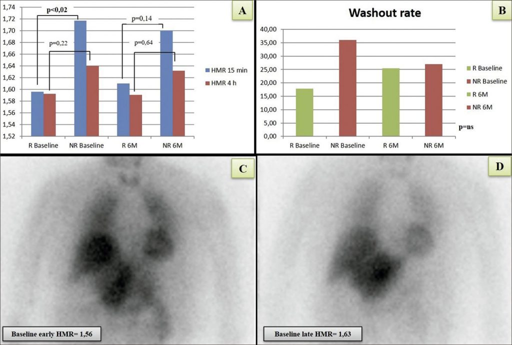 Hyperactivation of the sympathetic nervous system plays a central role in the pathophysiology of hypertension. The aim of this study was to assess cardiac sympathetic activity and investigate the role of myocardial123I-labelled meta-iodo benzyl guanidine ([123I] MIBG) scintigraphy in cardiovascular risk stratification of patients with resistant hypertension treated with renal denervation (RDN). Eighteen patients were included in this prospective study (mean age 56 ± 10 years old, 27.8% females). Transthoracic echocardiogram, general blood analysis and myocardial ([123I] MIBG scintigraphy were performed before and six-months after RDN. A patient was considered a responder (R) if a drop ≥ 5mmHg on mean systolic ambulatory blood pressure (BP) monitoring was observed at the six-month follow-up. 66.7% of patients were R (drop in systolic BP of 20.6 ± 14.5mmHg, vs minus 8 ± 11.6mmHg in non-responders (NR), p=0.001). Early heart-mediastinum ratio (HMR) was significantly lower at baseline in the R group (1.6 ± 0.1 vs 1.72 ± 0.1, p<0.02) but similar at six months. Considering both instants in time, the R group had lower early HMR values than the NR group (p<0.05). Both the late HMR and the washout rate were identical and no significant correlation between response to RDN or any MIBG imaging index was found. Renal denervation effectively lowered blood pressure in the majority of patients but [123I] MIBG was not useful in predicting the response. However, there was evidence of sympathetic overdrive and, both early and late HMR were overall reduced, probably putting this population at a higher risk of adverse events.