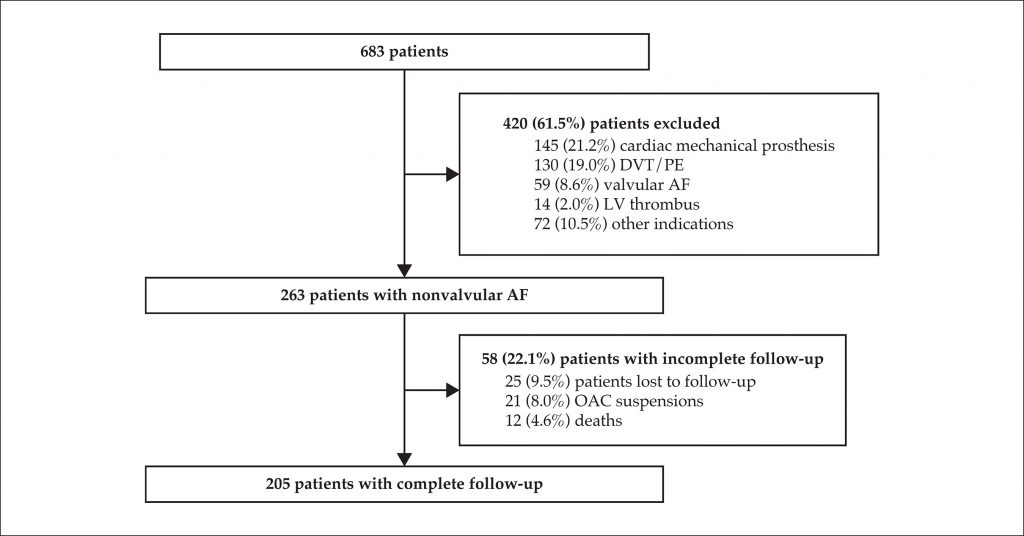 Retrospective cohort study including patients with nonvalvular AF attending an outpatient anticoagulation clinic of a tertiary hospital. Visits to the outpatient clinic and emergency, as well as hospital admissions to the institution, during 2014 were evaluated. The TTR was calculated through the Rosendaal´s method.