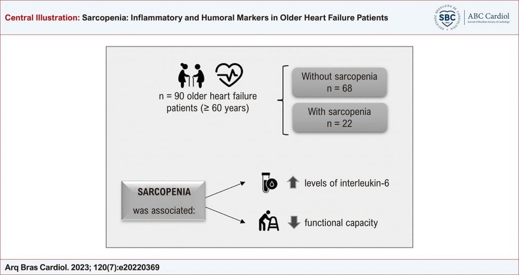 In this cross-sectional study, 90 outpatient HF patients, aged ≥ 60 years, were evaluated for sarcopenia (EWGSOP2 diagnostic criteria), inflammation (high-sensitive C-reactive protein [hs-CRP], Interleukin-6 [IL-6], tumor necrosis factor alpha [TNF-α]) and humoral markers (total testosterone and insulin-like growth factor-1 [IGF-1]), physical activity (International Physical Activity Questionnaire), quality of life (Minnesota Living with Heart Failure Questionnaire), and functional capacity (6-minute walk test). The adopted level of significance was p<0.05.