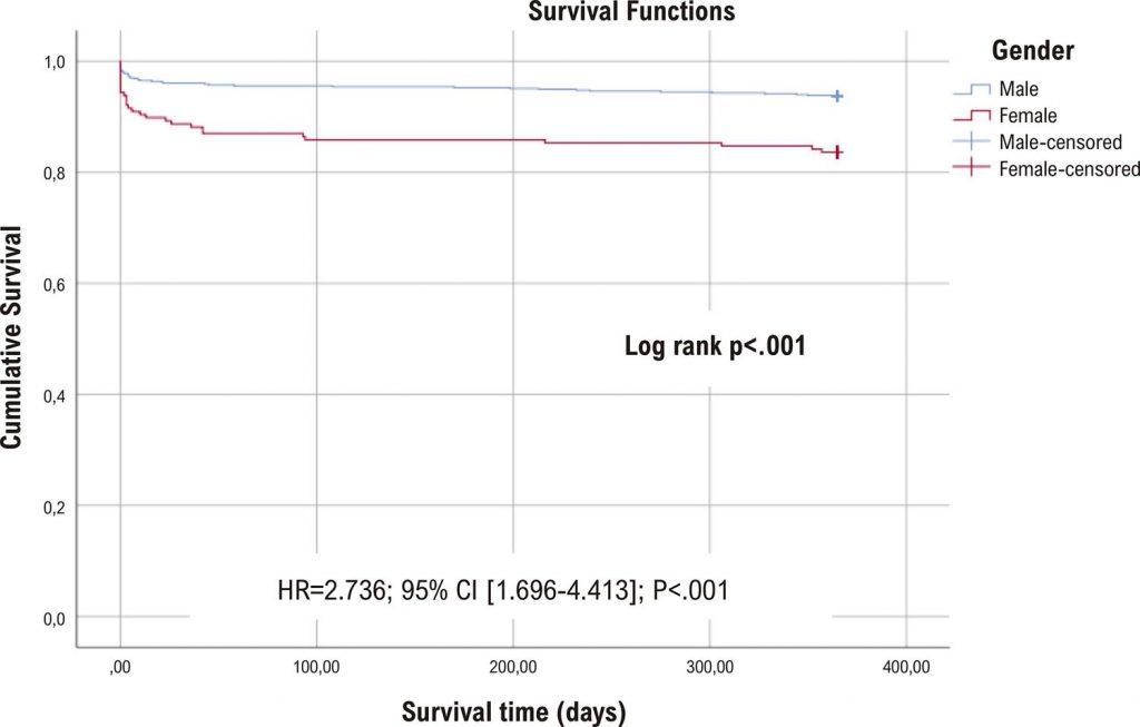 Women were older than man (69,1±14,6 vs. 58,5±12,7 years; p<.001) with higher prevalence of age over 75 years (36.7% vs. 11.7%; p<.001), diabetes (30,6% vs. 18,5%; p=.001), hypertension (60.5% vs. 45.9%; p=.001), chronic kidney disease (3.4% vs. 0.6%; p=.010) and acute ischemic stroke (6.8% vs. 3.0%; p=.021). At presentation, women had more atypical symptoms, less chest pain (p=.014) and were more frequently in cardiogenic shock (p=.011)). Women had longer time until reperfusion (p=.001) and were less likely to receive optimal medical therapy (p<0.05). In-hospital mortality (p=.001), at 30-days (p<.001), 6-months (p<.001) and 1-year (16.4% vs. p<.001) was higher in women. The multivariate analysis identified age over 75 years (HR=4.25; 95% CI[1.67-10.77];p=.002), Killip class II (HR=8.80; 95% CI[2.72-28.41];p<.001), III (HR=5.88; 95% CI [0.99-34.80]; p=.051) and IV (HR=9.60; 95% CI[1.86-48.59];p=.007), Acute Kidney Injury (HR=2.47; 95% CI[1.00-6.13];p=.051) and days of hospitalization (HR=1.04; 95% CI[1.01-1.08];p=.030) but not female gender (HR=0.83; 95% CI[0.33-2.10];p=.690) as independent prognostic factors of mortality.