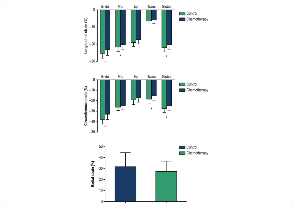 Forty-two anthracycline-treated survivors of large B-cell non-Hodgkin lymphoma, aged 55.83 ± 17.92 years (chemotherapy group) and 27 healthy volunteers, aged 51.39 ± 13.40 years (control group) were enrolled. The cumulative dose of epirubicin in chemotherapy group was 319.67 ± 71.71mg/m2. The time from last dose of epirubicin to the echocardiographic examination was 52.92 ± 22.32 months. Global longitudinal (GLS), circumferential (GCS) and radial strain (GRS), subendocardial, mid and subepicardial layer of longitudinal (LS-ENDO, LS-MID, LS-EPI) and circumferential strain (CS-ENDO, CS-MID, CS-EPI) values were analyzed. Transmural strain gradient was calculated as differences in peak systolic strain between the subendocardial and subepicardial layers. A value of p < 0.05 was considered significant.