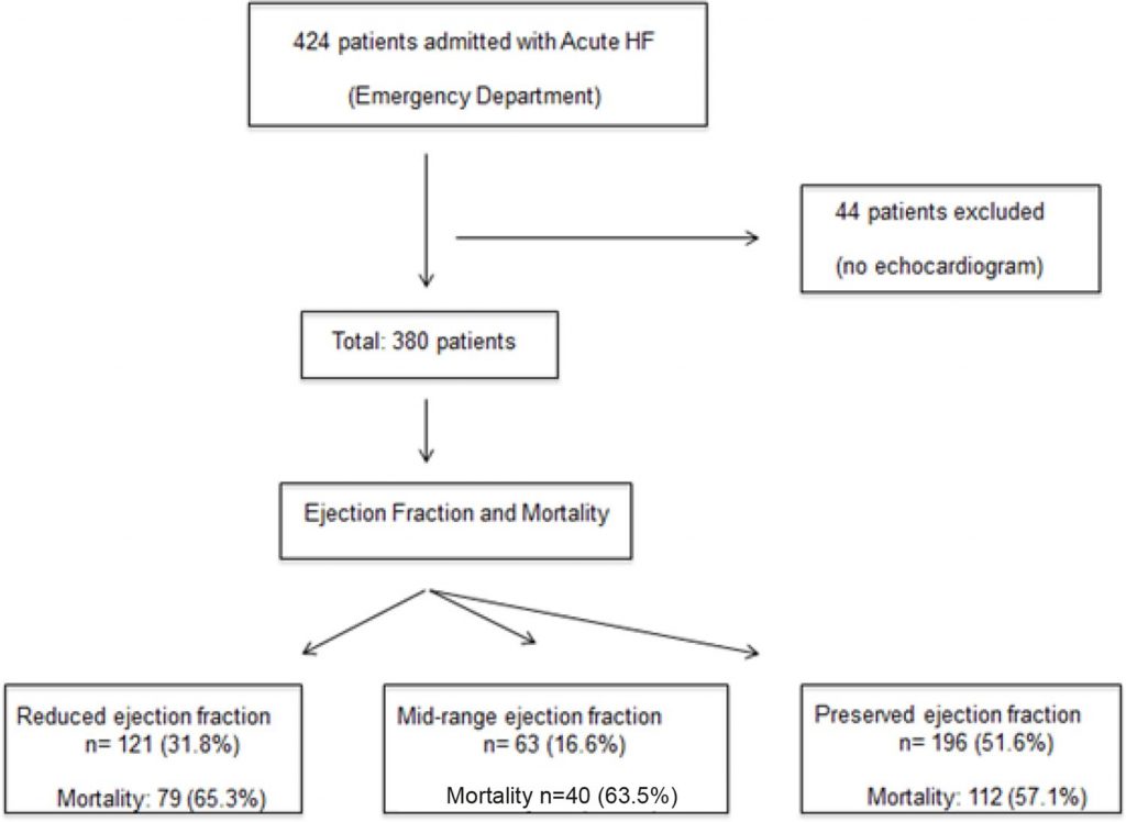 A cohort study that included adult patients with acute HF admitted through the emergency department to a tertiary hospital, reference in cardiology, in south Brazil from 2009 to 2011. The sample was divided into three groups according to EF: reduced, mid-range and preserved. A Kaplan-Meier curve was analyzed according to the EF, and a logistic regression analysis was done. Statistical significance was established as p < 0.05.
