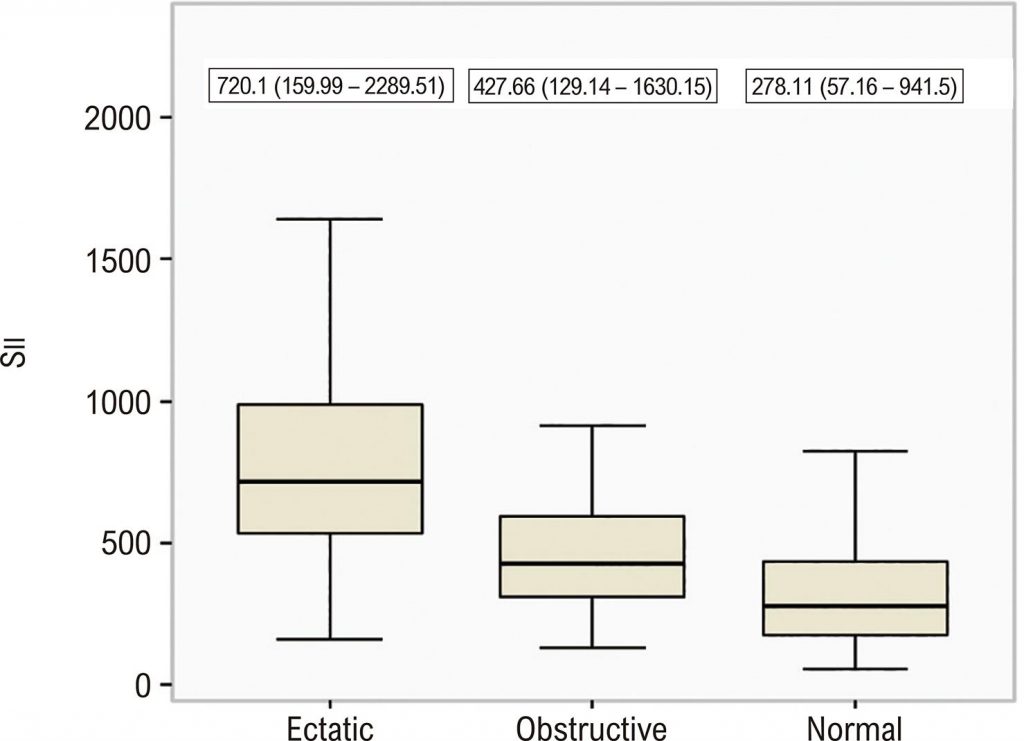 Sıı, NLR, platelet-to-lymphocyte ratio (PLR), and monocyte-to-high density lipoprotein cholesterol ratio (MHR) were significantly higher in the CE group compared with the other groups (all p<0.001). In multivariate analysis, Sıı (p<0.001, OR = 1.005, 95% CI =1.004-1.005) was found to be an independent predictor of isolated CE. In Receiver Operating Characteristic curve analysis, Sıı had a higher Area Under the Curve than NLR, PLR, and MHR. Sıı value of >517.35 has 79% sensitivity, 76% specificity for the prediction of the CE [AUC: 0.832, (p<0.001)]. Sıı had a significant correlation with the number of ectatic coronary arteries and Markis classification (r:0.214 p=0.002; r:-0.195, p=0.006, respectively).