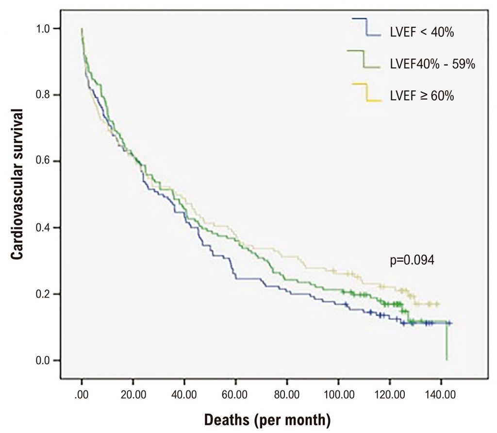 Definitions of left ventricular ejection fraction (LVEF) cut-off values for HF with mildly reduced LVEF (HFmrEF) have been a subject of debate, in the face of evidence that some drugs used in the treatment of HF with LFEV < 40% (HFrEF) are also effective in patients with LVEF < 60%. The aim of this study was to compare overall survival and cardiovascular survival in HF patients with LVEF of 40-59% in patients with HFrEF and HF with LVEF ≥ 60%. Patients with decompensated HF who met the Framingham diagnostic criteria at hospital admission between 2009 and 2011 were included. Patients were divided into HFrEF, HF with LVEF 40-59%, and HF with LVEF ≥ 60%. The Kaplan-Meier was used to determine ten-year overall survival and cardiovascular survival. The statistical significance was established at p<0.05. A total of 400 patients were included, with a mean age of 69 ± 14 years. Cardiovascular survival in patients with HF and LVEF of 40-59% was not significantly different than in patients with HFrEF (adjusted Hazard Ratio [HR] 0.86; 95% Confidence Interval [CI] 0.61-1.22, Ptrend = NS), but was statistically different compared with patients with LVEF ≥ 60% (adjusted HR of 0.64; 95% CI 0.44-0.94, Ptrend = 0.023). No difference was found in 10-year survival between the LVEF groups. Patients with HF and LVEF ≥ 60% had significantly higher cardiovascular survival compared with the other groups.