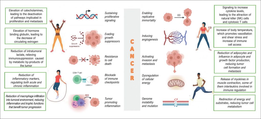 Breast cancer is the most prevalent cancer among women, accounting for nearly 30% of all cancers, while in men, it represents only 1% of cases. Breast cancer is the main cause of death for cancer, and its incidence and mortality vary according to patients’ ethnicity, geographic region, and socioeconomic status. Due to the low prevalence of breast cancer among men and the scarcity of studies in the literature, exercises have been prescribed based on extrapolations from studies on female patients. Scientific evidence has suggested beneficial effects of physical exercises on breast cancer prevention, treatment, and post-treatment. In addition to combatting sedentary behavior, it is essential to maintain a healthy body weight, limit alcohol consumption, and follow a balanced diet, rich in fruit, vegetables, grains and fibers, and limited in red meat. The effects of exercises are not restricted to breast cancer, but extend to controlling modifiable risk factors, and reducing the incidence of cardiovascular diseases, and all-cause and cardiovascular mortality.