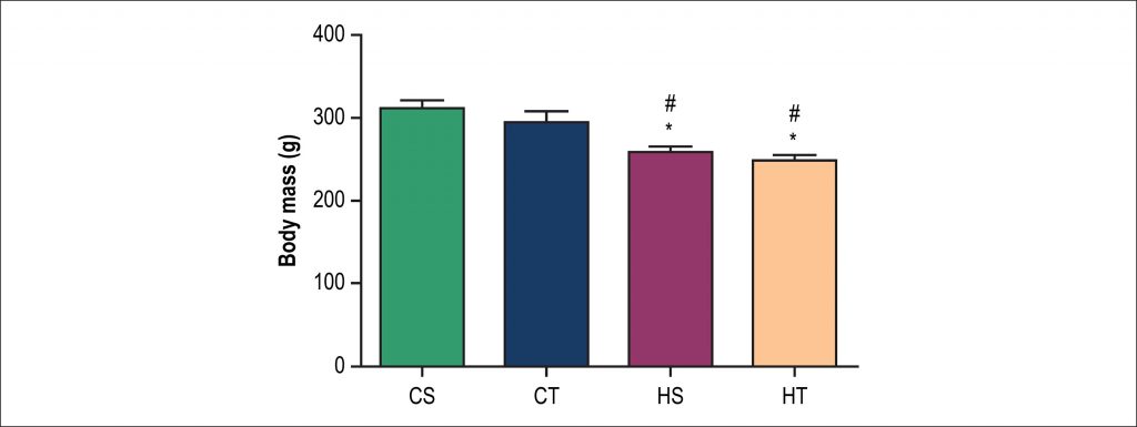 Resistance exercise training increased the soleus muscle mass in SHR when compared to HS (HS 0.027 ± 0.002 g/mm and HT 0.056 ± 0.003 g/mm). Resistance exercise training did not alter BP. On the other hand, in relation to baroreflex sensitivity, bradycardic response was improved in the TH group when compared to HS (HS -1.3 ± 0.1 bpm/mmHg and HT -2.6 ± 0.2 bpm/mmHg) although tachycardia response was not altered by resistance exercise (CS -3.3 ± 0.2 bpm/mmHg, CT -3.3 ± 0.1 bpm/mmHg, HS -1.47 ± 0.06 bpm/mmHg and HT -1.6 ± 0.1 bpm/mmHg).