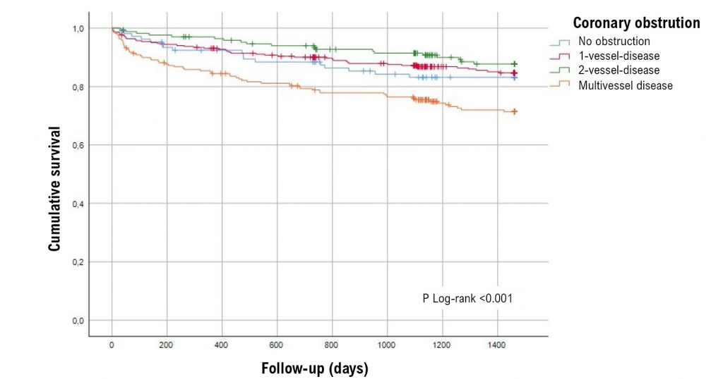 Poorer survival rates were detected among individuals with multivessel-disease (all-cause, CVD and CAD, p-log rank< 0.0001). After multivariate adjustments, multivessel-disease |(HR; 2.33 (CI 95%; 1.10-4.95)) and 1-vessel-disease obstructed (HR; 2.44 (CI 95%; 1.11-5.34)) had the highest risk for all-cause mortality compared to those with no obstruction at 4-year follow-up.