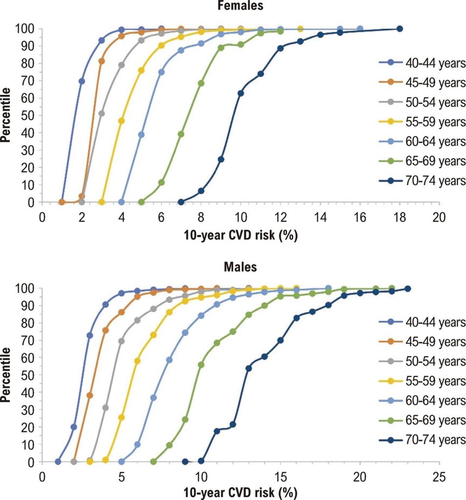 In a previous study, we determined laboratory-based percentiles of the WHO CVD risk distribution, according to sex and age, in the Brazilian Longitudinal Study of Adult Health (ELSA-Brasil) baseline population. These percentiles were associated with the calculated risk of atherosclerotic CVD up to 75 years, regardless of the estimated 10-year risk. Expressing the risk percentile has been proposed to increase risk awareness and improve adherence to preventive measures.–
