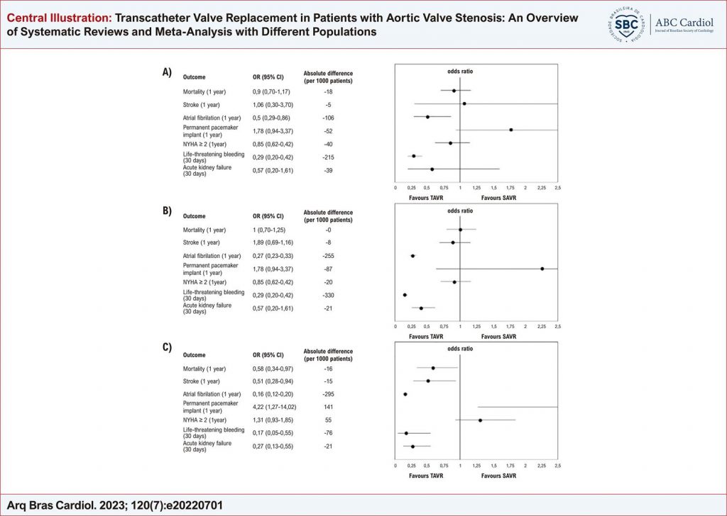 An overview of systematic reviews (SRs) was conducted following a structured protocol. Results were grouped by surgical risk, population characteristics, and different valves. RCTs in the SRs were reanalyzed through meta-analyses, and the results were summarized using the GRADE method. The adopted level of statistical significance was 5%.