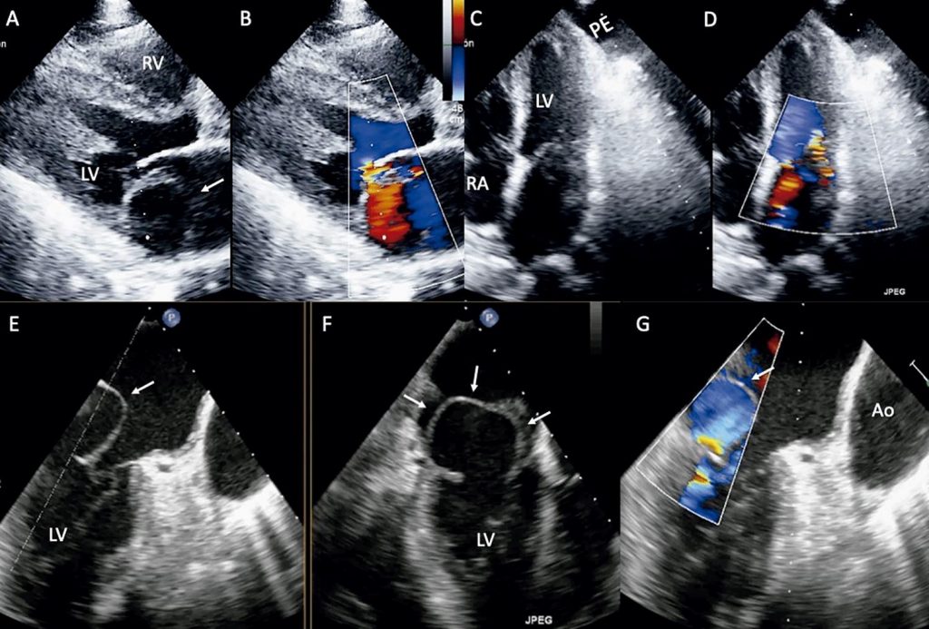 Transthoracic 2D Doppler echocardiography in the parasternal long axis view showing a cyst-like thin-walled atrium (A) and moderate mitral regurgitation (B). In the apical chamber a left pleural effusion (C) and also a moderate mitral regurgitation (D) were visualized. Transoesophageal 2D images at 60º and 90º (E-F) confirmed the presence of a heterogeneous cyst-like mass (white arrows) in the left atrium involving the posterior mitral annulus. The color Doppler revealed a blood flow to this cavity (G). LV: left ventricle; LA: left atrium; RA: right atrium; RV: right ventricle; Ao: aorta; PE: pleural effusion.