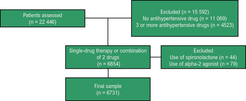 Cross-sectional study assessing patients who underwent BP monitoring in the TeleMRPA platform between 2017 and 2019. The exclusion criteria were: use of no antihypertensive drug; combined use of 3 or more antihypertensive drugs; and use of spironolactone and alpha-2 agonist. The variables analyzed were: age, sex, body mass index (BMI), number of valid BP measurements, means of systolic and diastolic blood pressure (SBP and DBP, respectively) obtained from HBPM and casual measurement, and the classes of antihypertensive drugs. Paired and unpaired t tests, as well as chi-square test, were used. The 5% significance level was adopted.