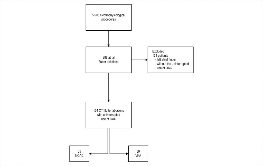 The uninterrupted use of oral anticoagulation (OAC) with vitamin K antagonists (VKAs) for electrophysiology procedures has been more and more recommended. The clinical practice in our service recommends the continuous use of these drugs for atrial flutter ablation. There is little evidence as to the uninterrupted use of non-vitamin K antagonist oral anticoagulants (NOACs) in this scenario.
