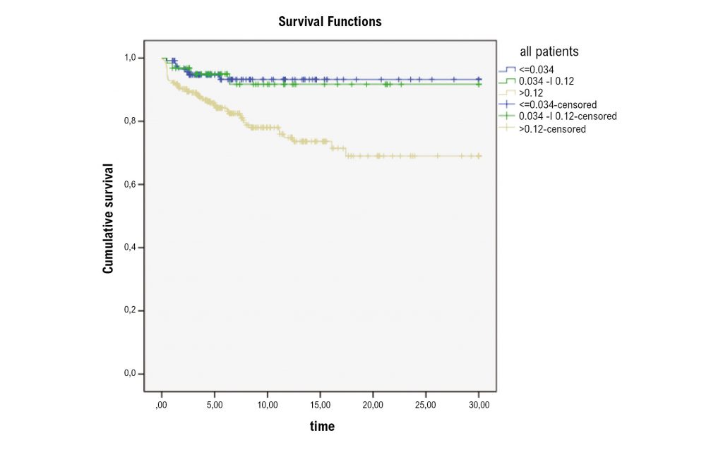 A total of 494 patients with ACS were evaluated. Troponin > 99th percentile and below the cutoff point, as well as values above the cutoff, were associated with higher incidence of composite endpoint (p<0.01) and higher rates of percutaneous or surgical revascularization procedures (p<0.01), without significative difference in 30-day mortality.