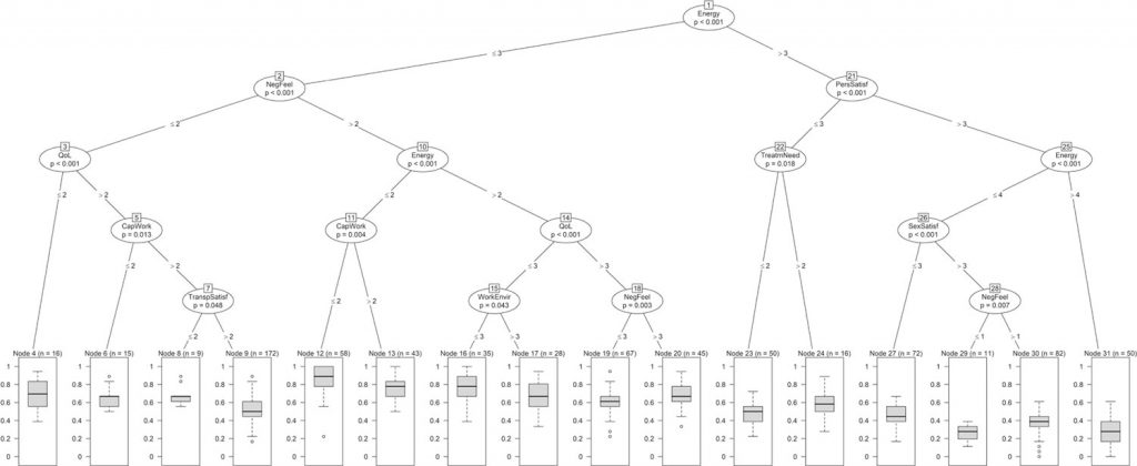 Prospective, observational study performed from July 28 to September 27, 2020, in Brazil, with women physicians from 47 specialities, the most frequent being cardiology (22.8%), with no age restriction. They voluntarily answered an online survey with questions on demographic and socioeconomic characteristics, quality of life (WHOQOL-brief), spirituality (WHOQOL-SRPB), and statements from the Oldenburg Burnout Inventory. Statistical analysis used the R software, beta regression, classification trees, and polychoric correlation matrix, with a 5% of significance level.