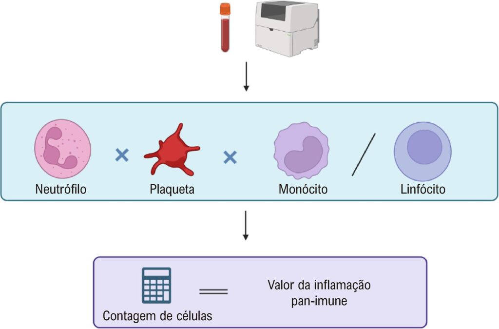 Um novo marcador de inflamação foi introduzido recentemente. O valor pan-imune-inflamatório (PIV) é calculado a partir dos componentes imunoinflamatórios do sangue periférico, incluindo contagens de neutrófilos, plaquetas, monócitos e linfócitos, conforme mostrado na . O PIV demonstrou ser prognóstico em alguns distúrbios cardiovasculares e em doenças não cardiovasculares, como câncer e doença renal avançada.–