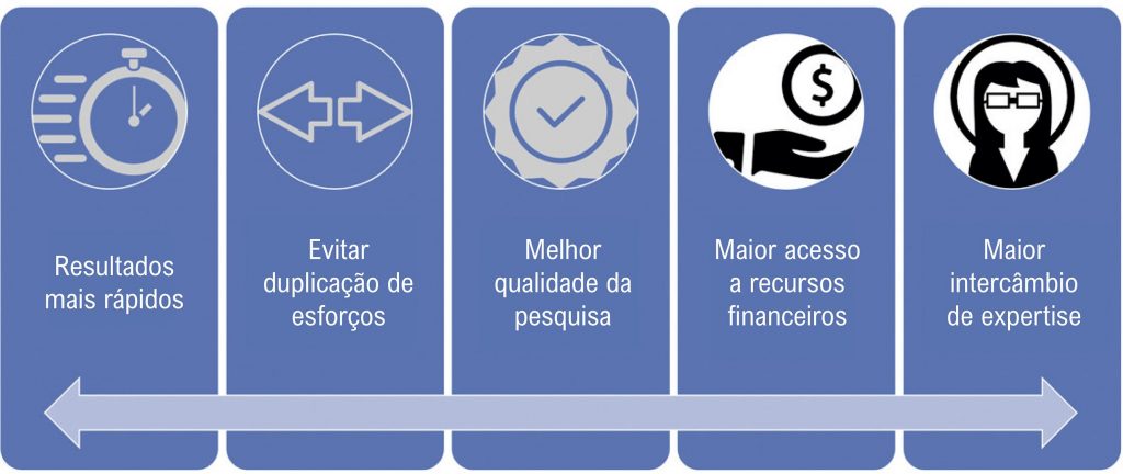 A pesquisa científica colaborativa é a chave para acelerar o ritmo da pesquisa. O modelo tradicional de pesquisa científica envolve um processo lento e muitas vezes fragmentado de descoberta, validação e disseminação. No Brasil, um exemplo seminal de colaboração é a iniciativa de coalizão que reúne mais de 70 centros em todo o país e conduziu vários ensaios clínicos randomizados com mais de 5.000 participantes. Um bom exemplo de seus resultados é o estudo da Coalizão Covid Brasil III, que demonstrou que a dexametasona melhora pacientes com COVID-19 grave.2 Esses resultados são comparáveis ao histórico Recovery Trial, que demonstrou pela primeira vez que em pacientes hospitalizados com Covid-19, a dexametasona resultou em menor mortalidade em 28 dias.3 Estudos de Coalizão também mostraram que a hidroxicloroquina, com ou sem azitromicina, não beneficiou casos leves a moderados4 ou casos graves de COVID-19.5